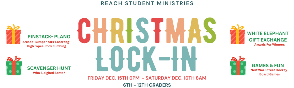 This event is hosted by Redeemer Covenant Church located in Carrollton, TX 75007. For more information contact: Pastor Tre’ Crume870-275-2484 [email protected]COST: $20/StudentSee Reach Christmas Lock-In Schedule Sign Up Below!